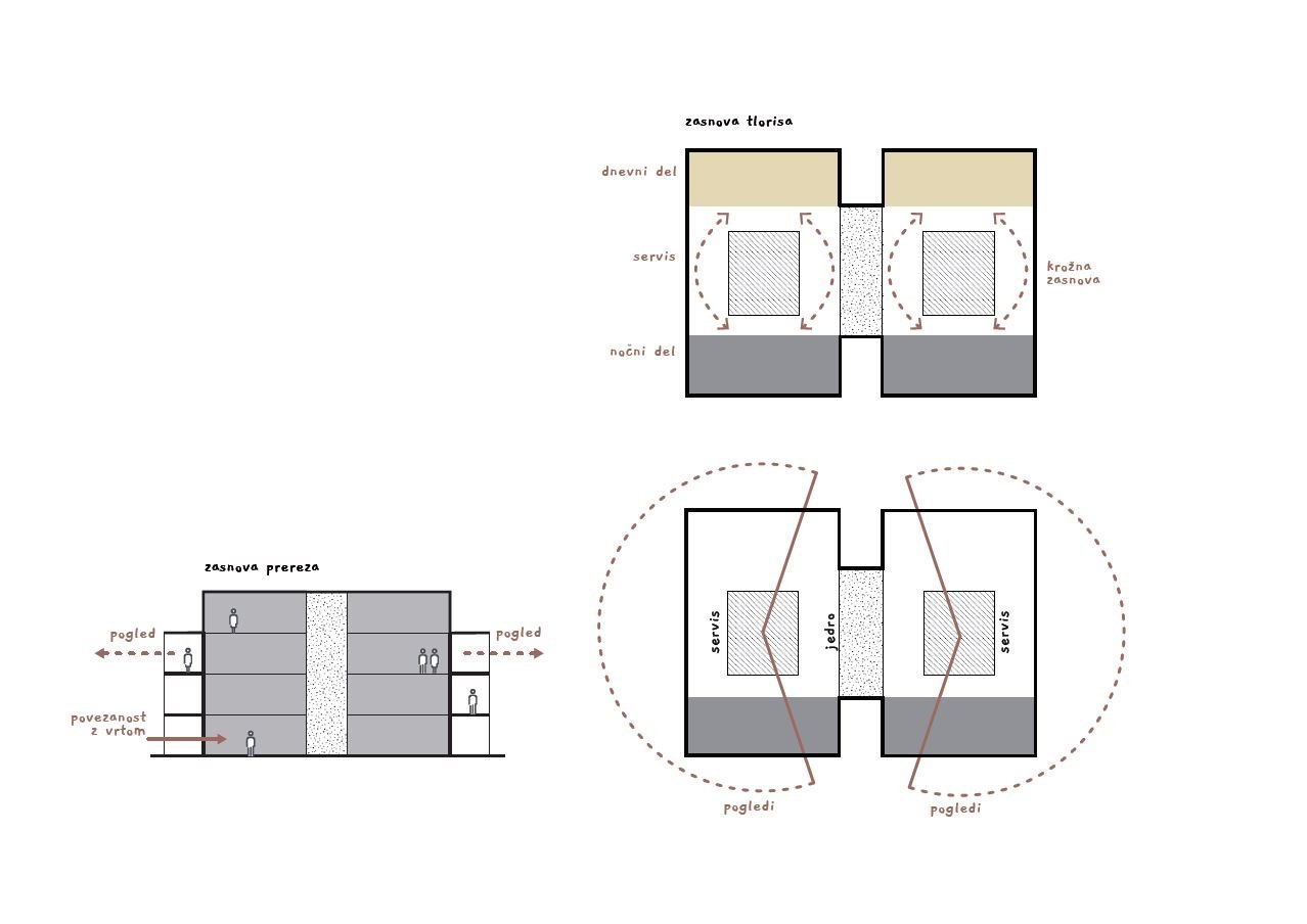 The floor plan allows for any number of residential units per floor, namely 2, 3 or 4 residential units per floor. The top floor or penthouse is moved inside, which reduces the sense of heaviness of the volume, and allows the placement of only one larger residential unit. The concept is based on an open circular floor plan. Thus, the residential units do not have unnecessary corridors. The core with installations is in the middle, and attached are the sanitary facilities and the kitchen. Sleeping and living spaces are arranged around the perimeter, which are sensibly proportioned according to the orientation in the room and the passage of sunlight. On the ground floor of each villa block, there are common areas such as a bicycle room and a utility room.