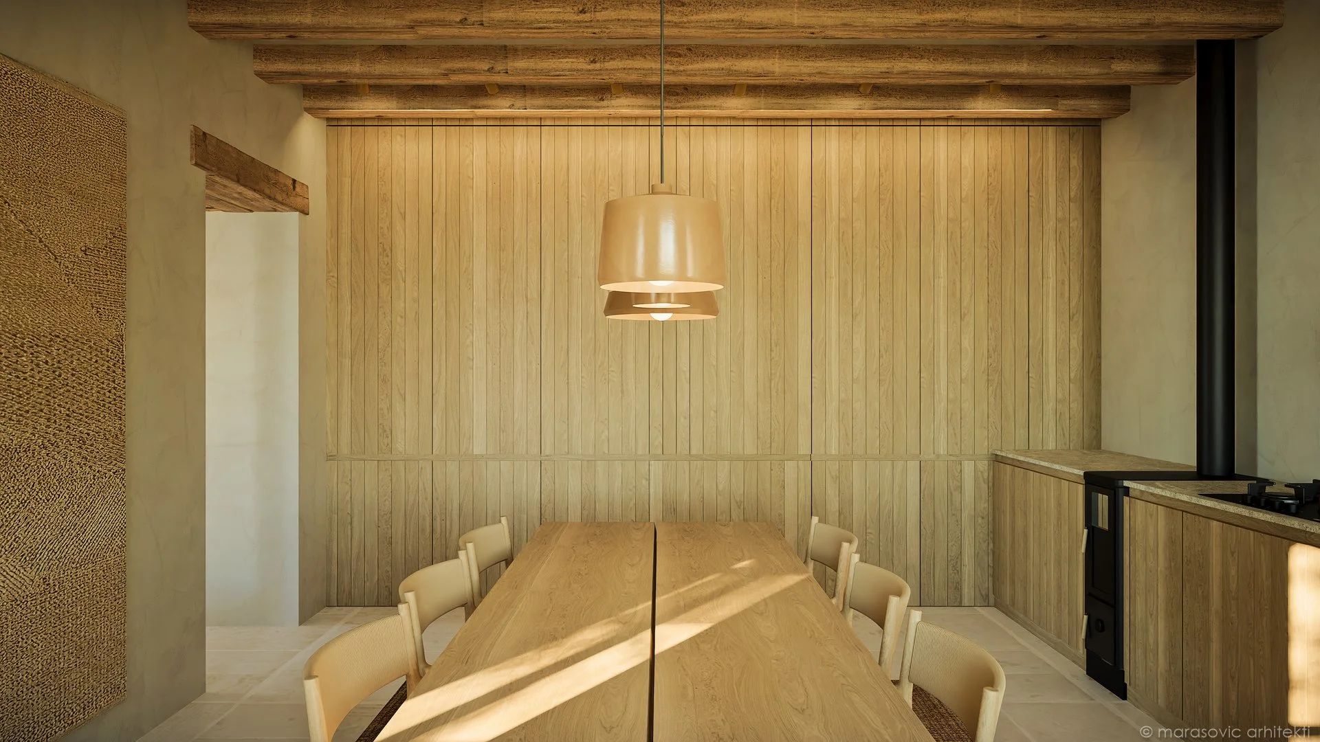 Special attention was given to materials that bridge the traditional and the contemporary. The kitchen, made of wooden planks in a modern interpretation, together with the central black fireplace that also functions as a cooking element, creates a strong spatial focal point.